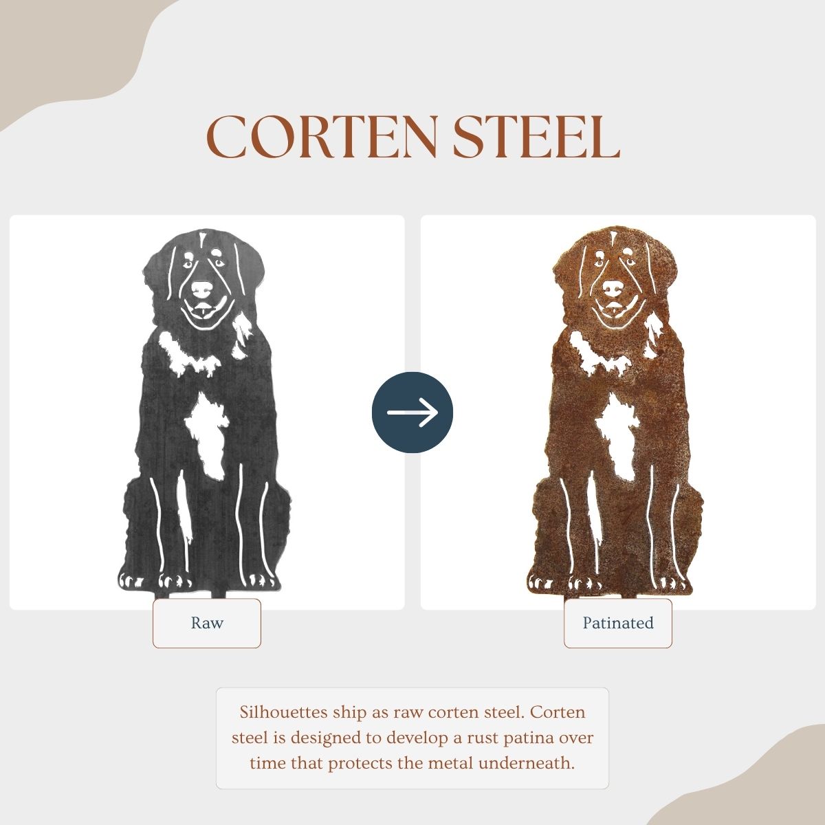 The Corten steel finish is designed to develop a beautiful patina rust coating that will change over time, protecting the steel underneath. These silhouettes ship out as raw steel and will develop a patina if left in the weather or frequently exposed to wet conditions. The color of the patina should change over time, starting as brighter orange tones and changing to darker brown tones.