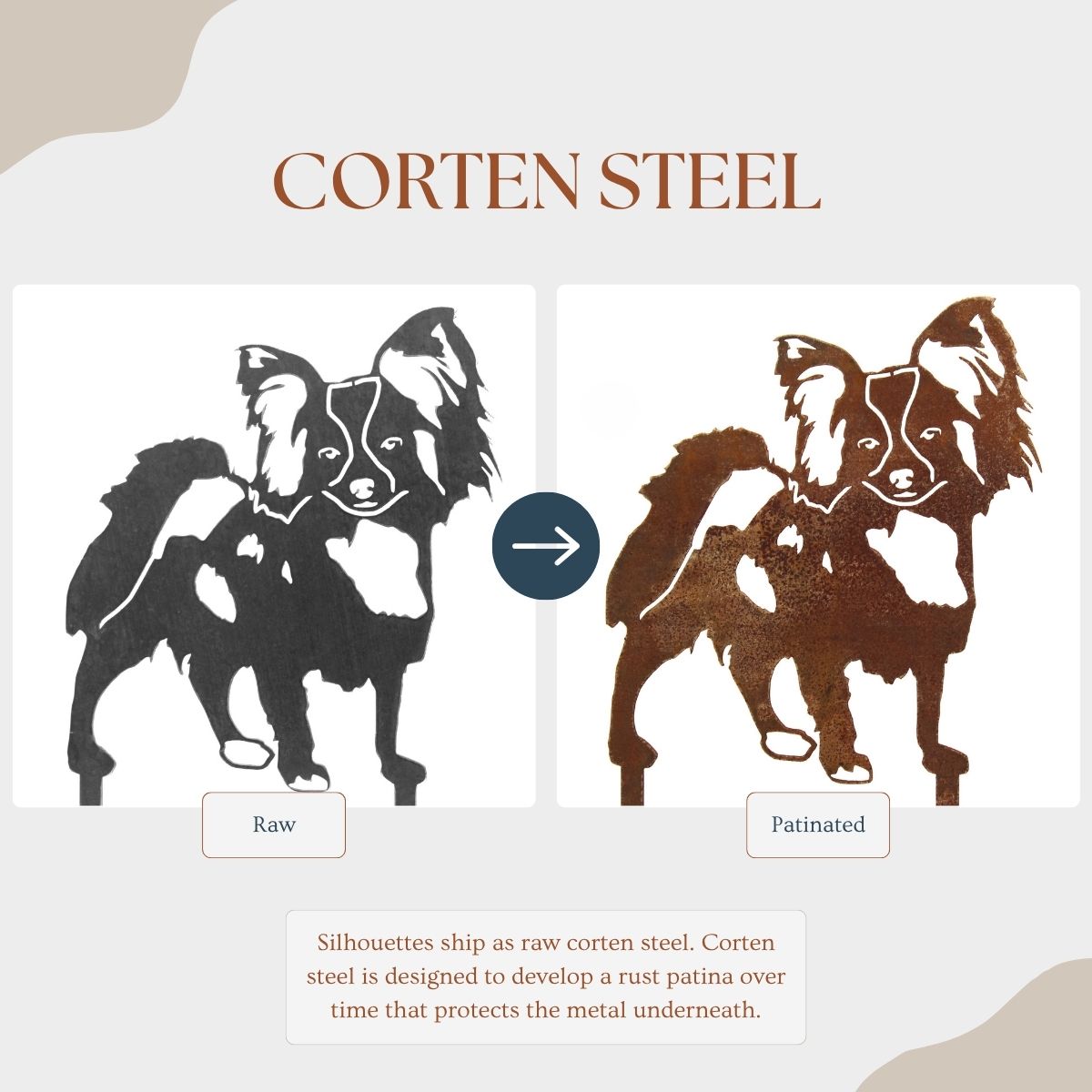 The Corten steel finish is designed to develop a beautiful patina rust coating that will change over time, protecting the steel underneath. These silhouettes ship out as raw steel and will develop a patina if left in the weather or frequently exposed to wet conditions. The color of the patina should change over time, starting as brighter orange tones and changing to darker brown tones.