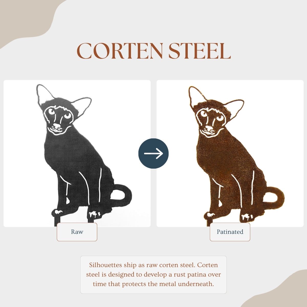 The Corten steel finish is designed to develop a beautiful patina rust coating that will change over time, protecting the steel underneath. These silhouettes ship out as raw steel and will develop a patina if left in the weather or frequently exposed to wet conditions. The color of the patina should change over time, starting as brighter orange tones and changing to darker brown tones.