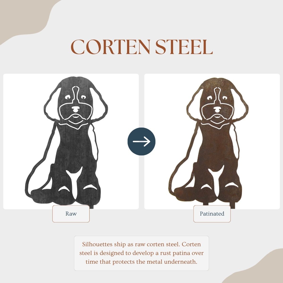 Metal Rescue silhouettes are handmade in the United States from sturdy 11 gauge premium weathering steel, also known as Corten steel. Each design is available in two different finishes- Corten steel and Black.